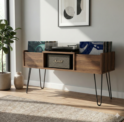 This record player cabinet with legs combines modern design with thoughtful functionality, creating an elegant focal point for your living space.