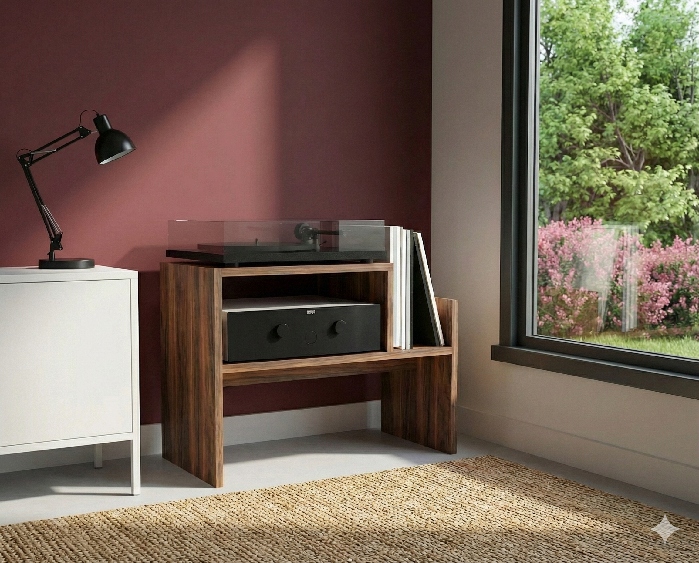 This record player cabinet with legs combines modern design with thoughtful functionality, creating an elegant focal point for your living space.